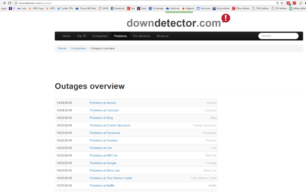 Huge number of disrupted services today (October 24 2016) including Comcast and Verizon: